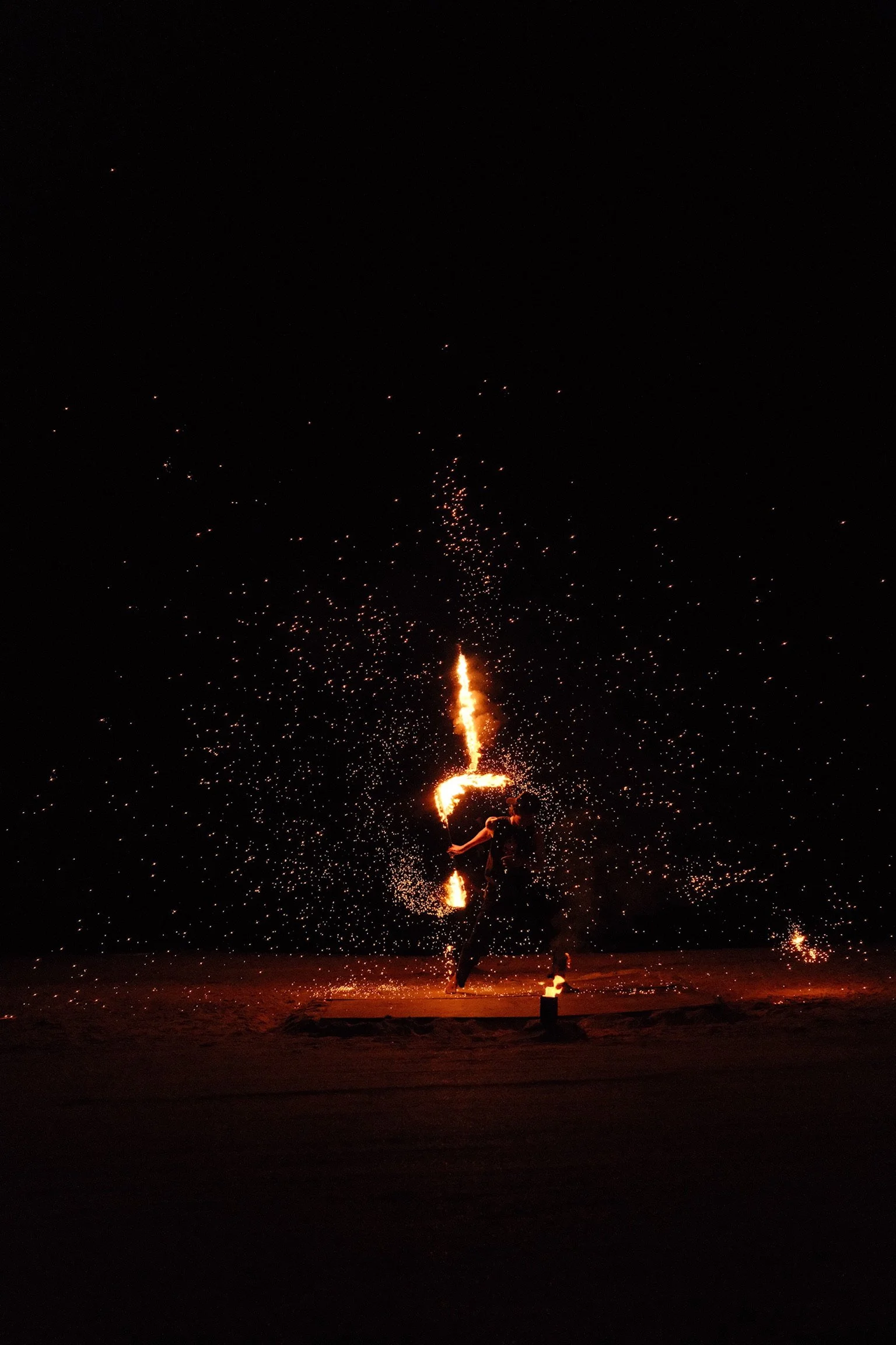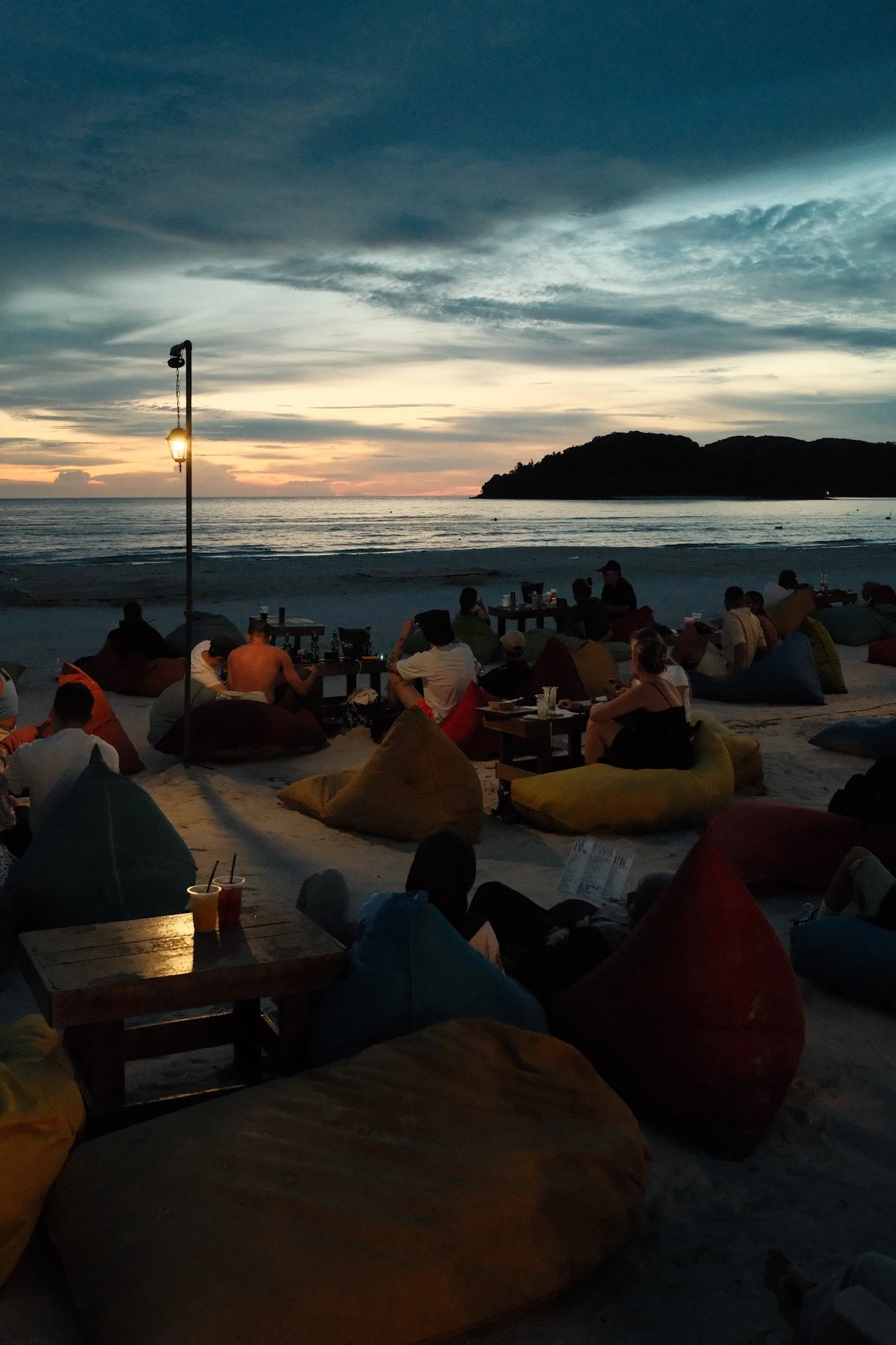 Tegen de avond verandert de sfeer compleet: muziek klinkt uit de beachbars, het zand wordt oranje van de zonsondergang, en iedereen zakt neer op grote zandzakken met een cocktail in de hand. Zodra de zon onder is, begint de vuurshow van lokale artiesten — een magisch moment vol muziek, vlammen en gezelligheid.