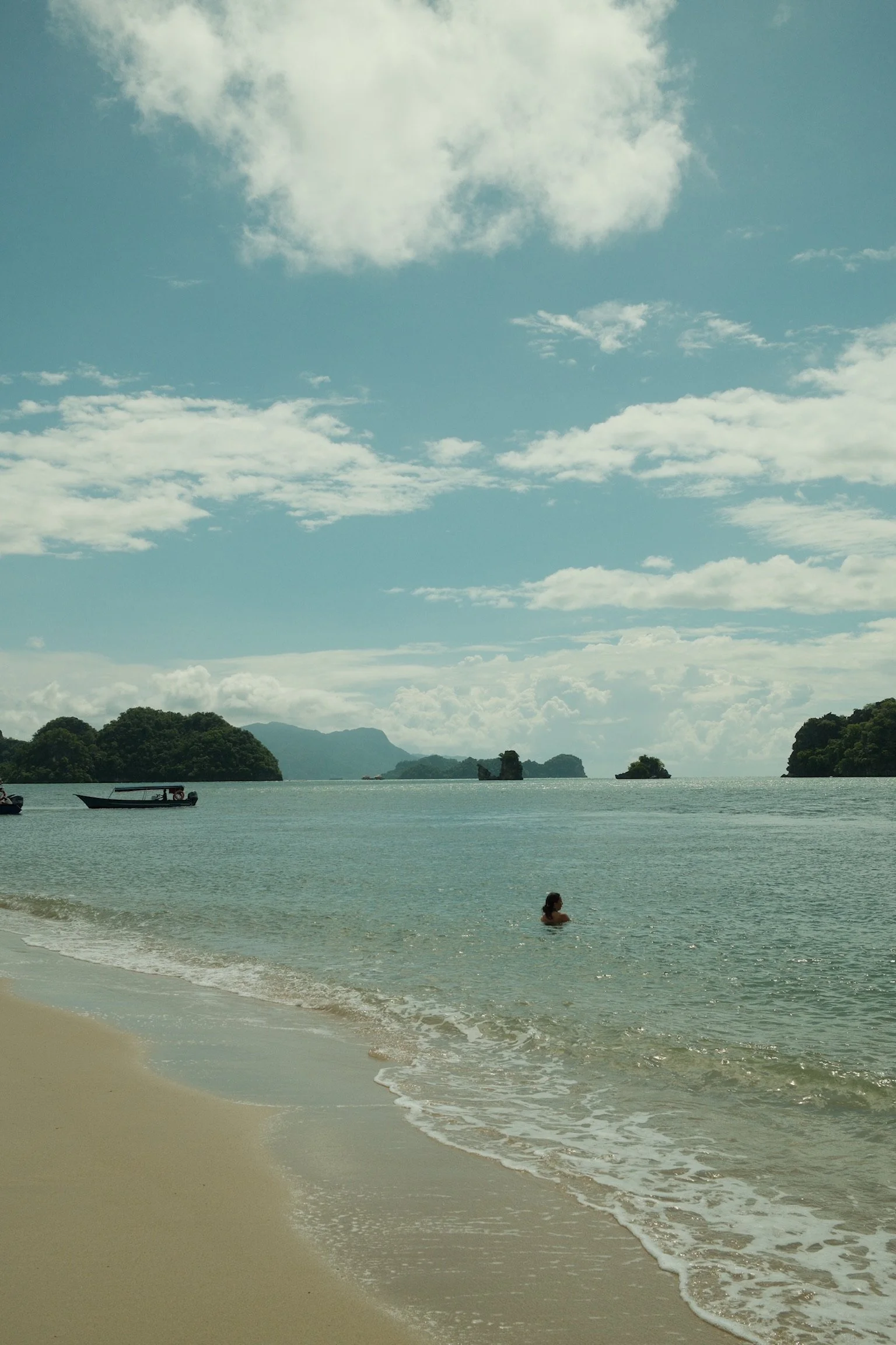 Aan de noordkant van het eiland ligt Tanjung Rhu, een breed en rustig strand met helderblauw water en uitzicht op kleine eilandjes voor de kust. De rit ernaartoe is al prachtig, en eenmaal daar voelt het bijna onwerkelijk hoe stil en schoon het is.